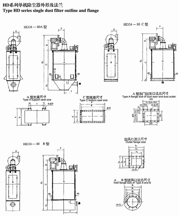 HD型袋式除塵器有六種規格:分A、B、C三型,A型設灰門、B型設抽屜,C型既不設灰門也不帶抽屜,下部加法蘭根據用戶要求直接配接在庫頂、料倉、皮帶運辦機等揚塵設備上就地除塵,粉塵直接回收。