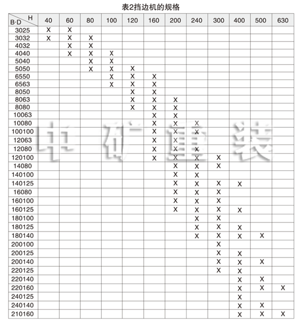 3、規格:按基帶寬B(cm)、檔邊高H(mm)和傳動滾筒直徑D(cm)可以組合成101中規格(見表2)。