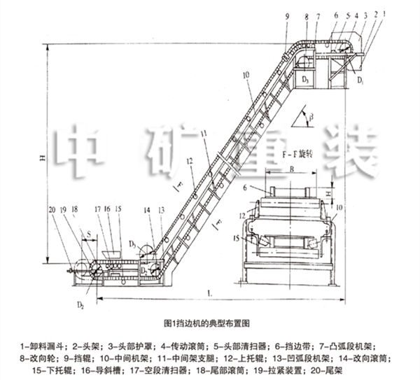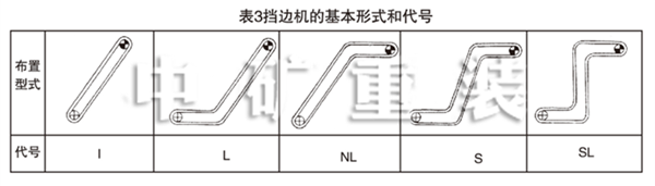 DJ、JB波狀檔邊帶式輸送機的基本布置型式和代號見表3。這是五種基本的布置型式,實際上,由于檔邊機采用了波狀檔邊輸送帶和改向輪及改向輥組等過度裝置,檔邊機可以在同一垂直面內多次彎曲,實現更為復雜的布置型式。